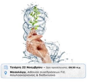 - στο Μεσολόγγι στις 22-11-2023 (Τετάρτη) και ώρα 9:30 π.μ. για το Προσχέδιο της 2ης Αναθεώρησης ΣΔΛΑΠ του Υδατικού Διαμερίσματος Δυτικής Στερεάς Ελλάδας-04, στην Αίθουσα Συνεδριάσεων Περιφερειακής Ενότητας Αιτωλοακαρνανίας (Κύπρου 30, Μεσολόγγι).